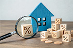 Lupe, Holzhaus und Würfel mit Prozentzeichen